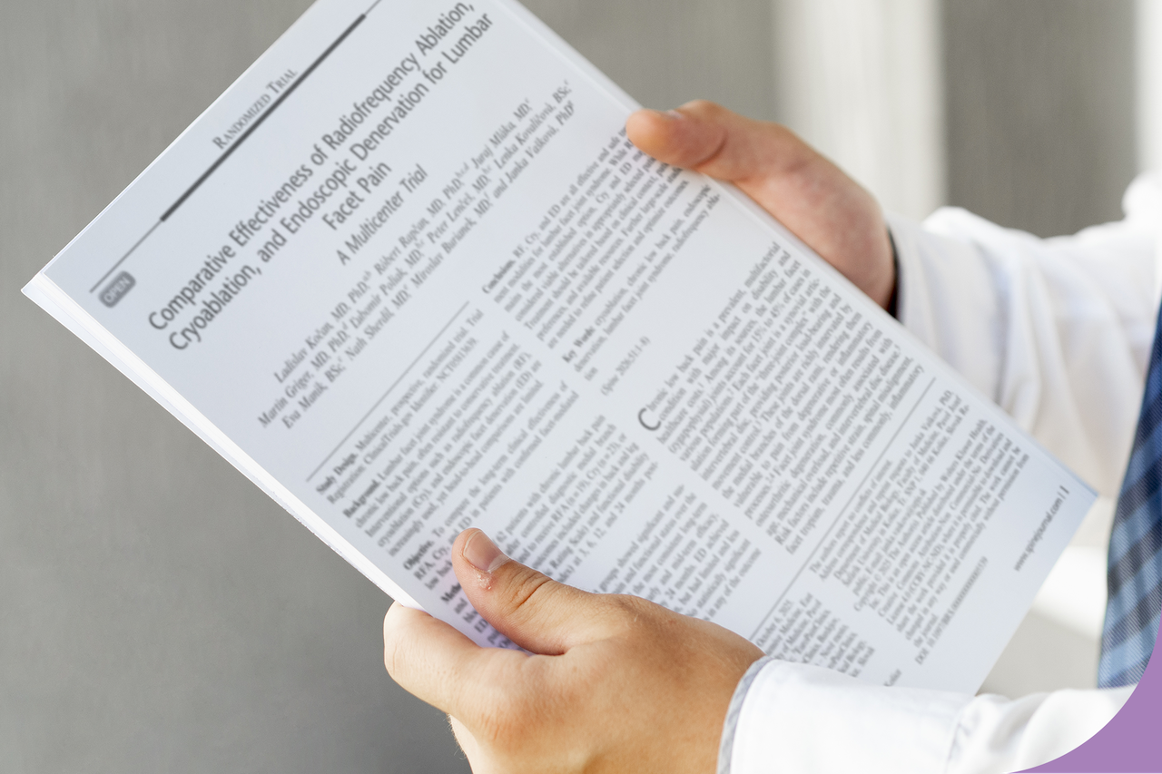 Hlavní autori, doc. MUDr. Ladislav Kočan, PhD, FIPP, MUDr. Róbert Rapčan, FIPP, MBA, PhD., a kolektív spoluautorov v článku „Comparative Effectiveness of Radiofrequency Ablation, Cryoablation, and Endoscopic Denervation for Lumbar Facet Pain: A Multicentral Trial“ predstavujú výsledky multicentrickej prospektívnej randomizovanej klinickej štúdie (registrácia ClinicalTrials.gov: NCT05813639). Štúdia prebiehala po dobu dvoch rokov a zahŕňala sledovanie 62 pacientov s chronickou bolesťou bedrovej chrbtice v dôsledku fazetového syndrómu.