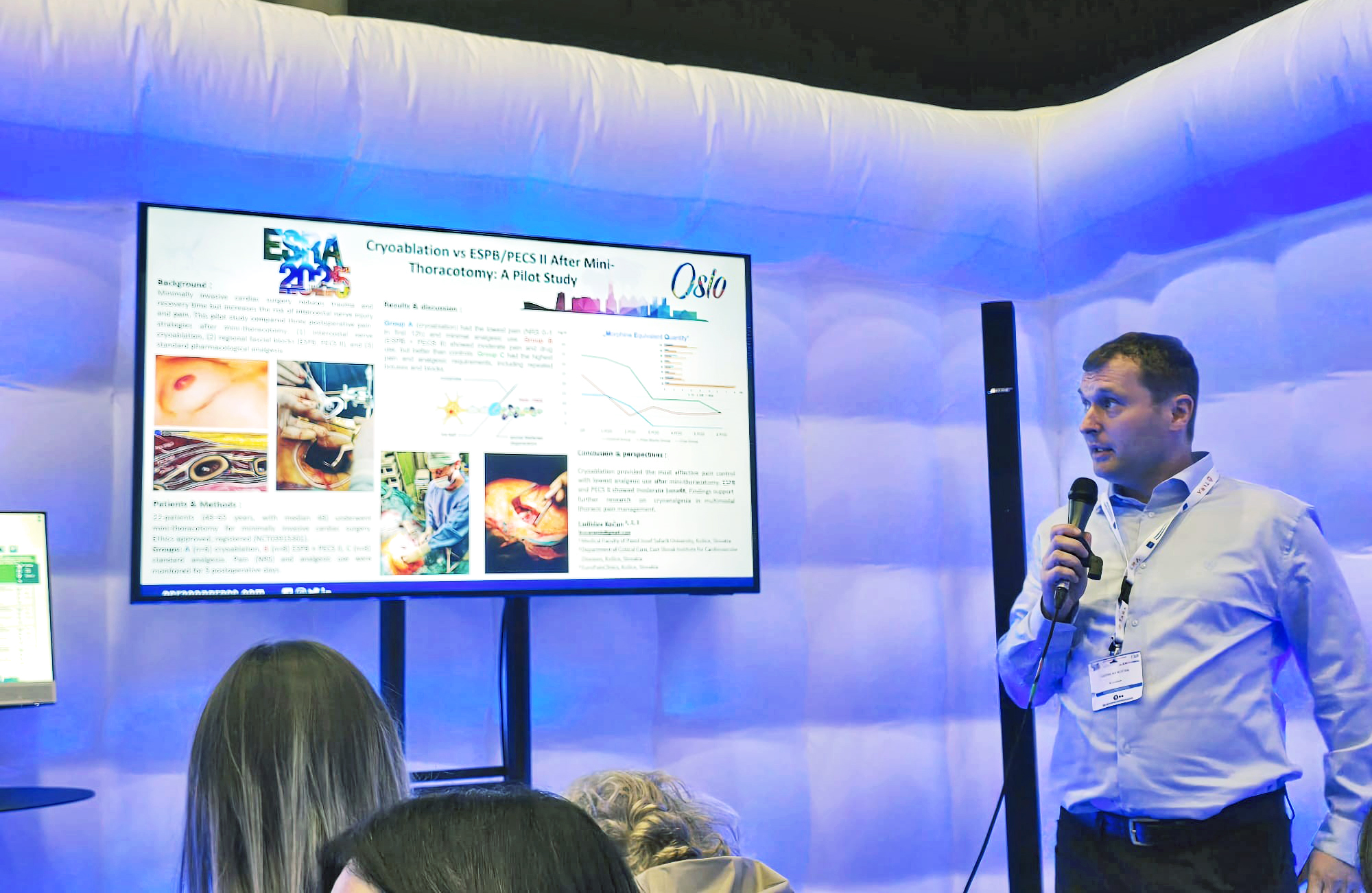 Doc. Kočan na konferencii predstavil odborný poster, na ktorom prezentoval výsledky prebiehajúcej klinickej štúdie s názvom: „Cryoablation vs. ESPB/PECS II After Mini-Thoracotomy: A Pilot Study“. Štúdia realizovaná s podporou EuroPainClinics sa zameriava na porovnanie účinnosti kryoablácie a regionálnych blokád (ESPB/PECS II) v rámci manažmentu pooperačnej bolesti po minitorakotómii. Predbežné výsledky prinášajú cenné poznatky pre klinickú prax a môžu významne prispieť k rozšíreniu terapeutických možností v oblasti akútnej pooperačnej bolesti.