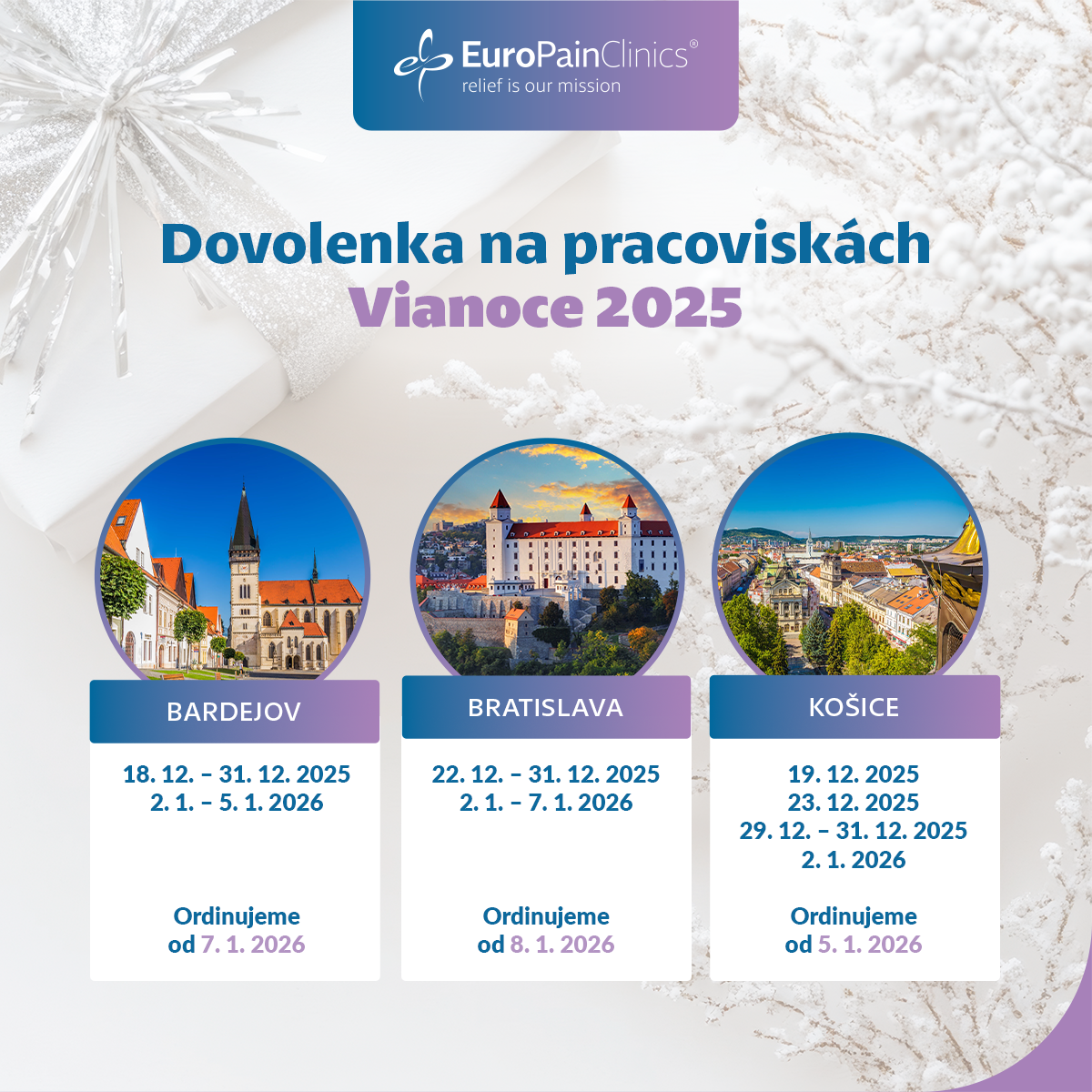 Vážení pacienti, dovoľujeme si vás informovať o dočasnom obmedzení prevádzkovej doby na našich pracoviskách EuroPainClinics Bratislava, Košice a Bardejov počas tohtoročných vianočných sviatkov z dôvodu dovoleniek.
