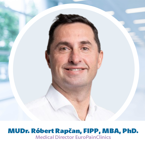 Vysoko špecializovanú liečbu osobne vykonáva MUDr. Róbert Rapčan, FIPP, MBA, PhD. – medzinárodne uznávaný odborník na intervenčnú liečbu bolesti a garant segmentu regeneratívnej medicíny v EuroPainClinics. Špičkové metódy regeneratívnej medicíny pri liečbe bolesti, aplikované individuálne aj v kombinácii s inovatívnymi intervenčnými technikami, MUDr. Rapčan tiež vyučuje a prezentuje na rade medzinárodných kongresov a sympózií.